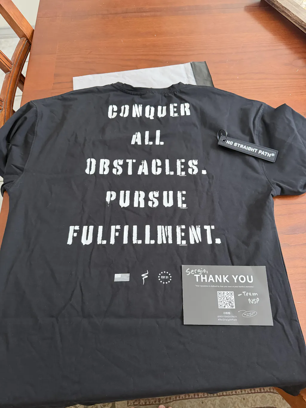 Elevate your streetwear game with the No Straight Path 'Mission Collection' Oversized Tee. This tee showcases a sleek 'Tri-Logo' on the front and our mission 'Conquer All Obstacles. Pursue Fulfillment.' on the back, delivering minimalist style with a powerful message. Crafted from a comfortable cotton/elastane blend, it's the perfect fit for fitness enthusiasts, military veterans, and all-around athletes. Whether you're at the gym or hitting the streets, this tee is your versatile choice for a bold, mission-driven look.